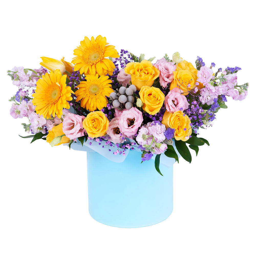 Шляпная коробка из роз и гербер