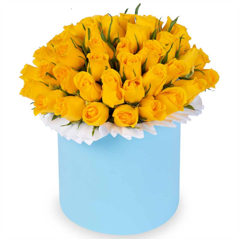 51 желтая роза в голубой шляпной коробке
