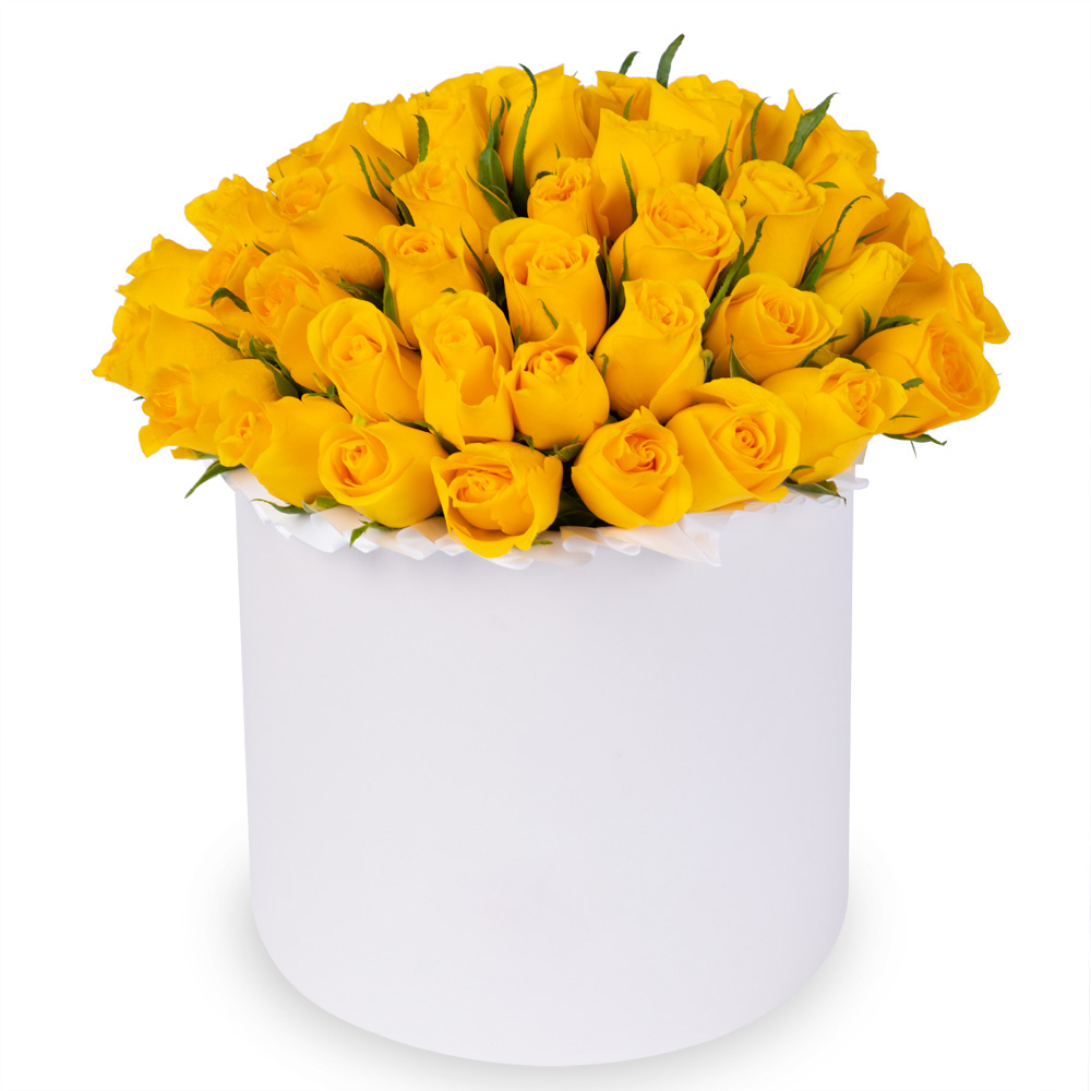 51 желтая роза в белой шляпной коробке