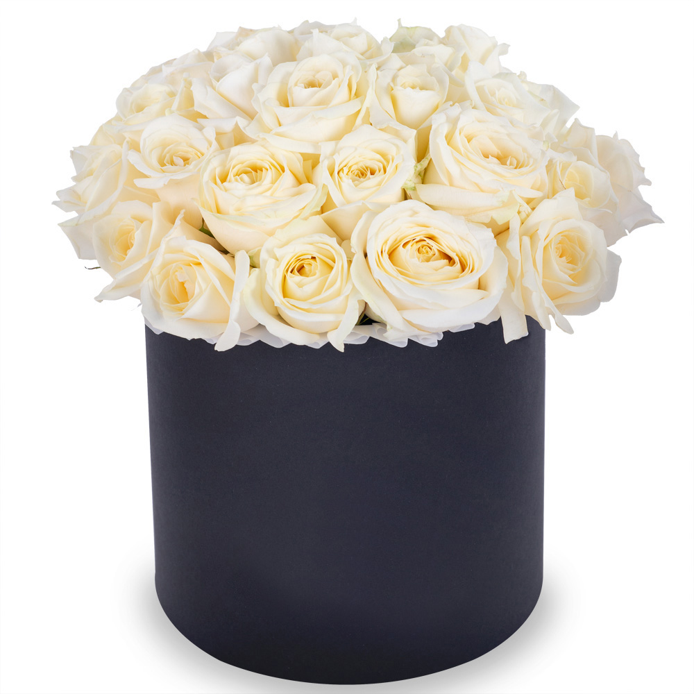 Букет из 35 белых роз premium в черной шляпной коробке