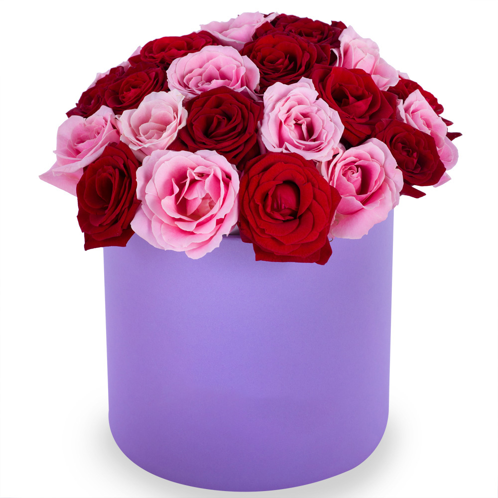 Букет из 35 разноцветных роз premium в фиолетовой шляпной коробке