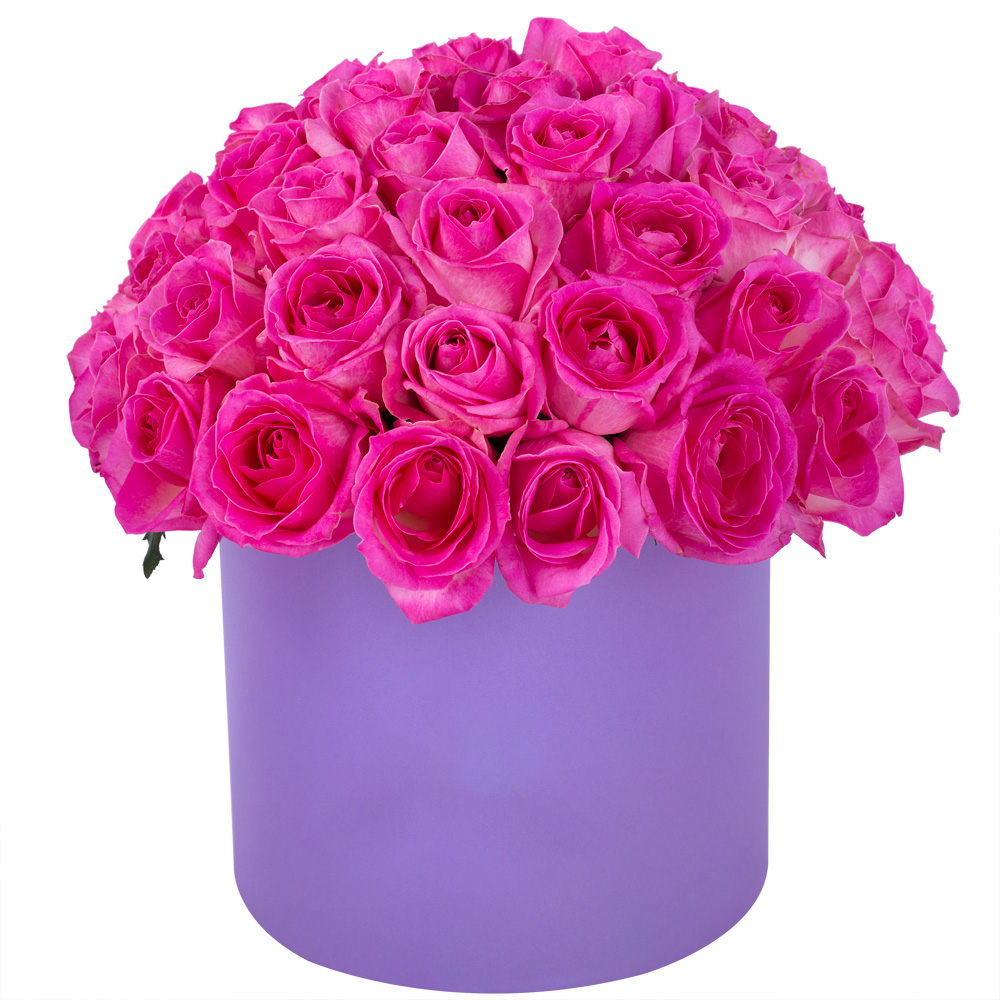 Букет из 51 малиновой розы premium в фиолетовой шляпной коробке