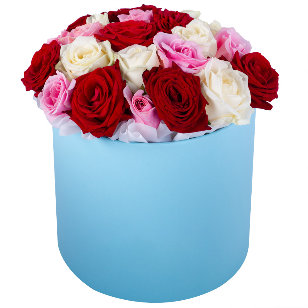 Букет из 21 разноцветной розы premium в голубой шляпной коробке