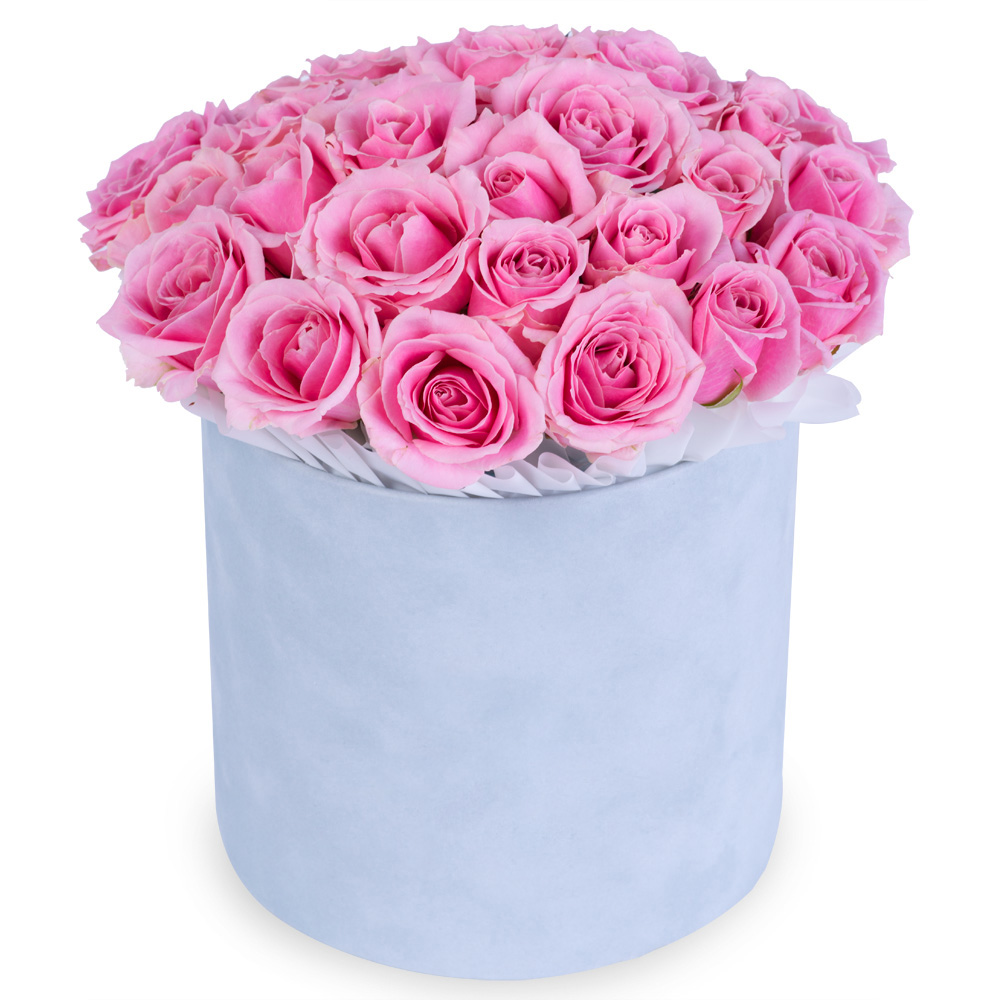 25 розовых роз premium в серой бархатной шляпной коробке
