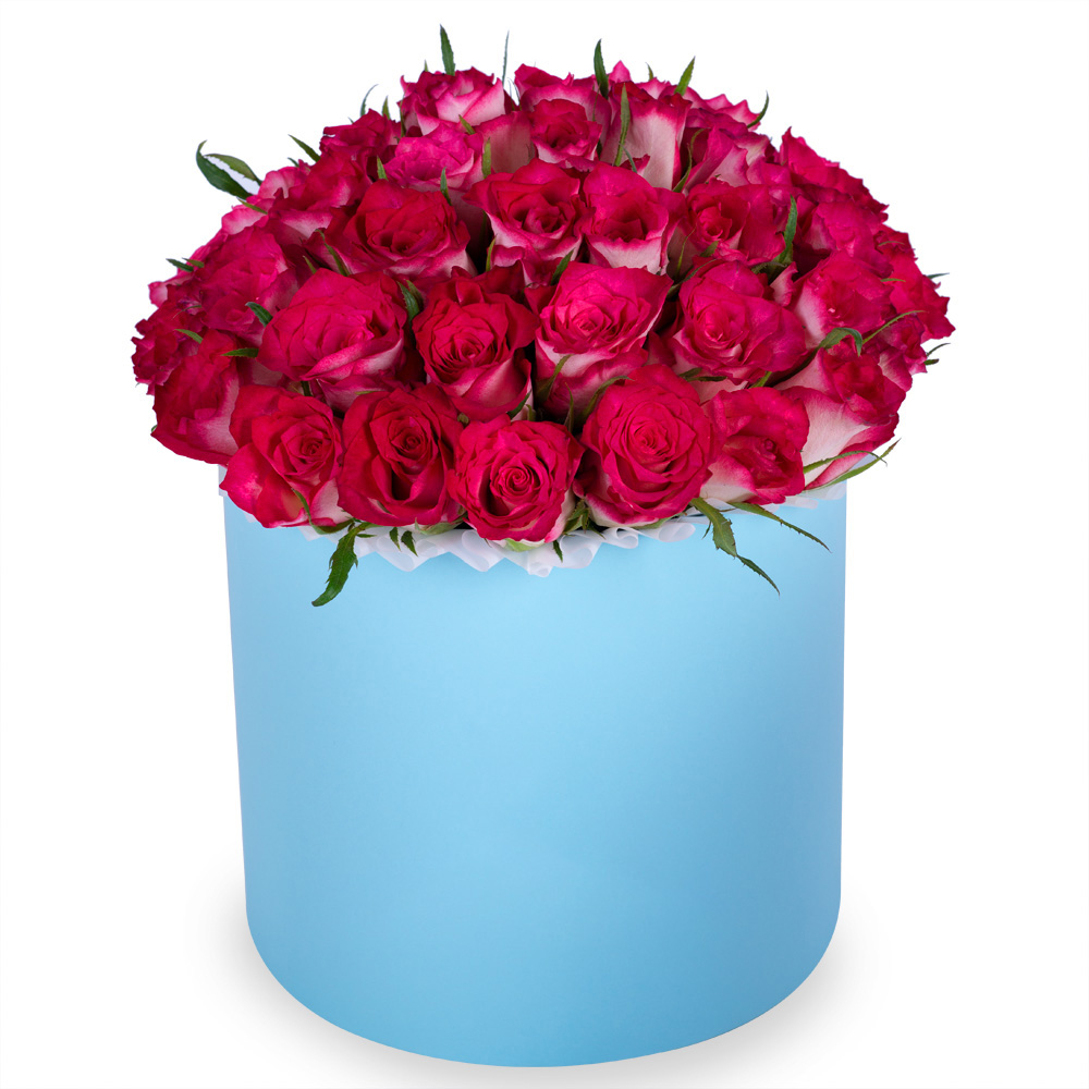 Букет из 51 бело-малиновой розы в голубой шляпной коробке