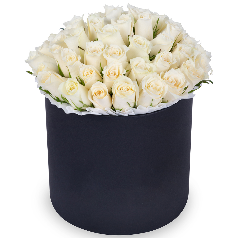 51 белая роза в черной шляпной коробке