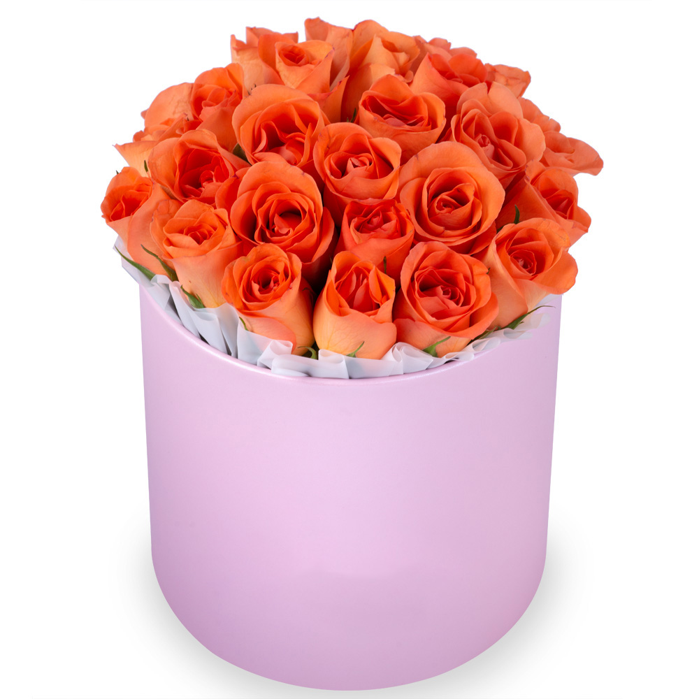 25 оранжевых роз в розовой шляпной коробке