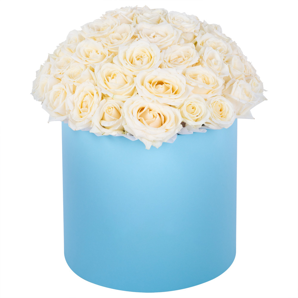 Букет из 51 белой розы premium в голубой шляпной коробке