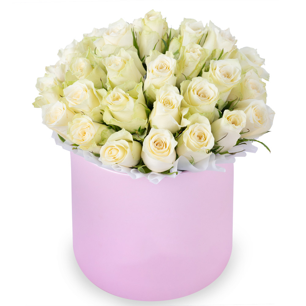 25 белых роз в розовой шляпной коробке