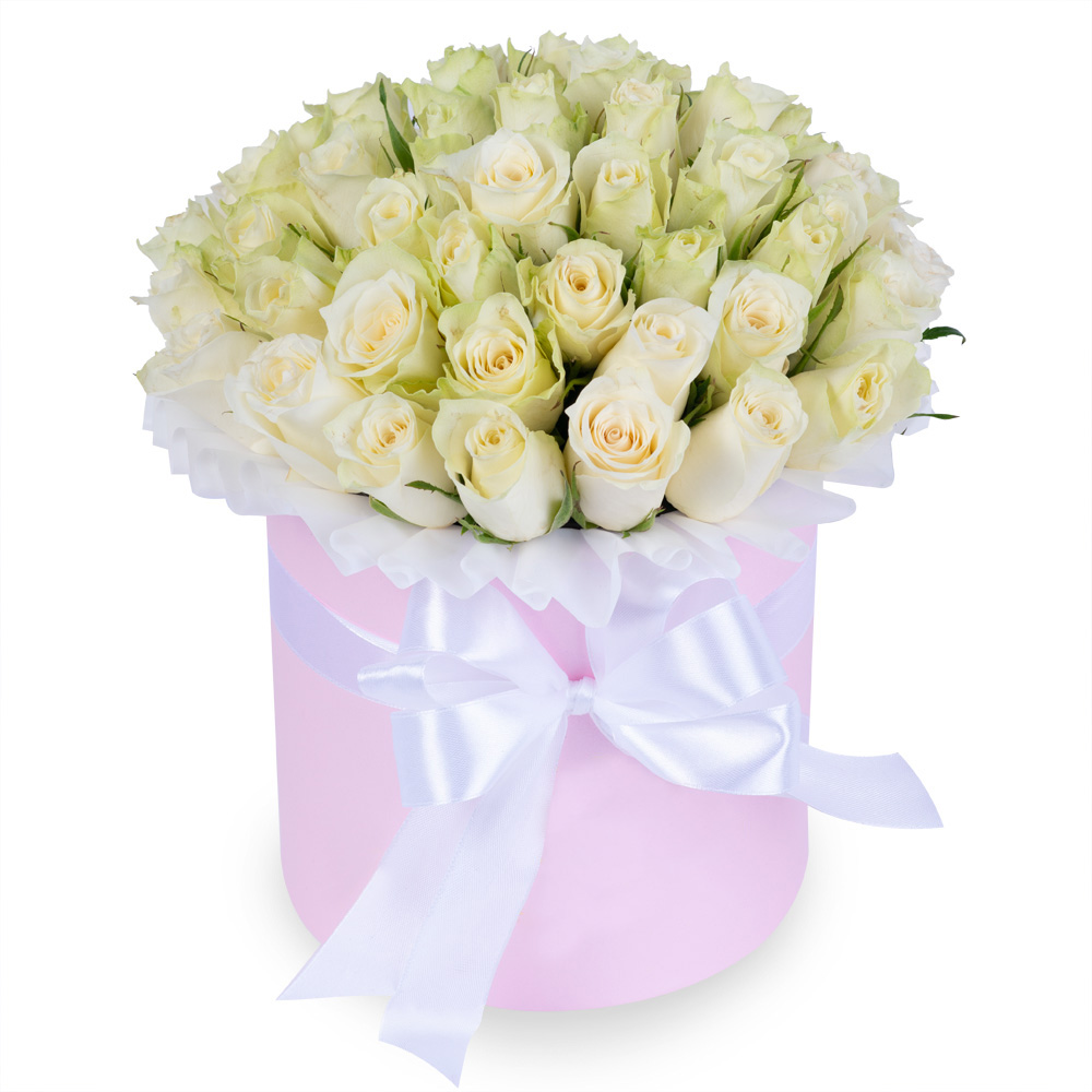 Букет из 35 белых роз в розовой шляпной коробке