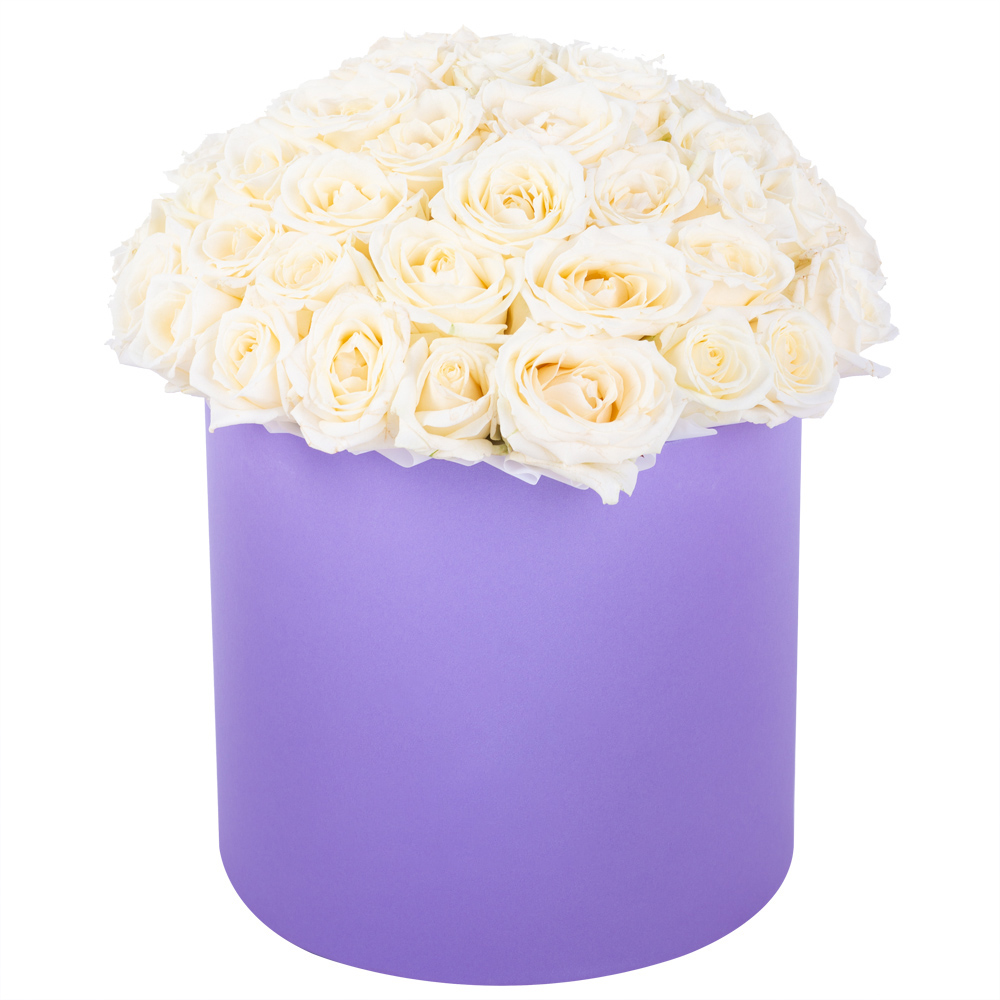 Букет из 51 белой розы premium в фиолетовой шляпной коробке