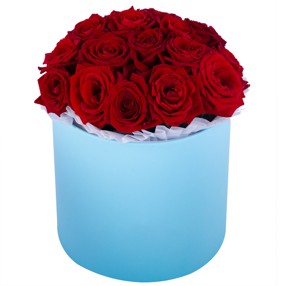 Букет из 19 красных роз premium в голубой шляпной коробке