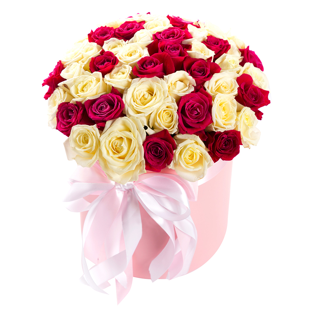 51 малиновая и белая роза в шляпной коробке