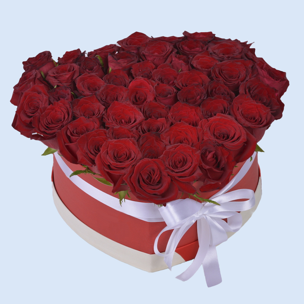 51 красная роза в коробке в форме сердца