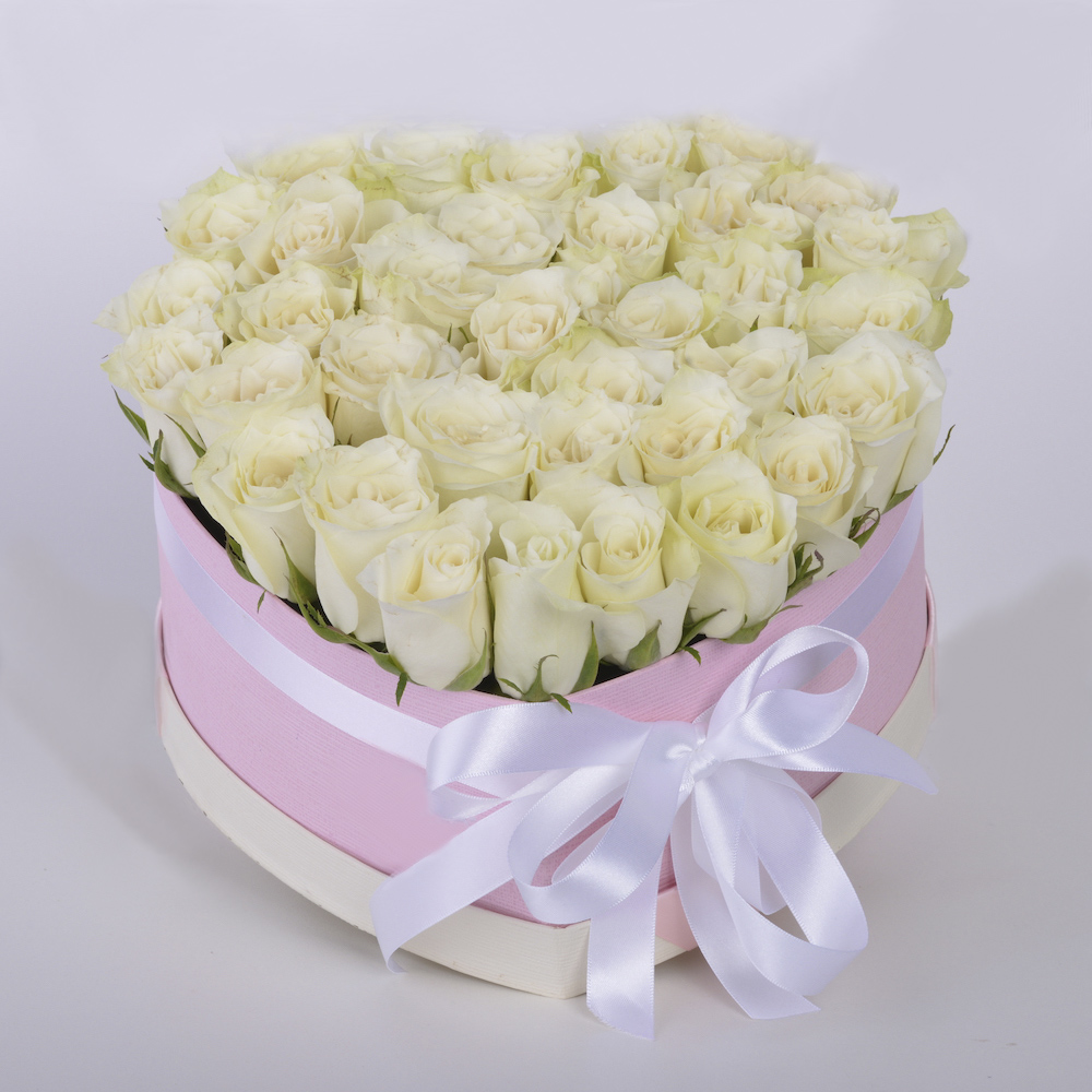 35 белых роза в коробке в форме сердца