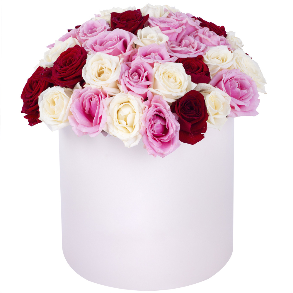Букет из 51 разноцветной розы premium в кремовой шляпной коробке