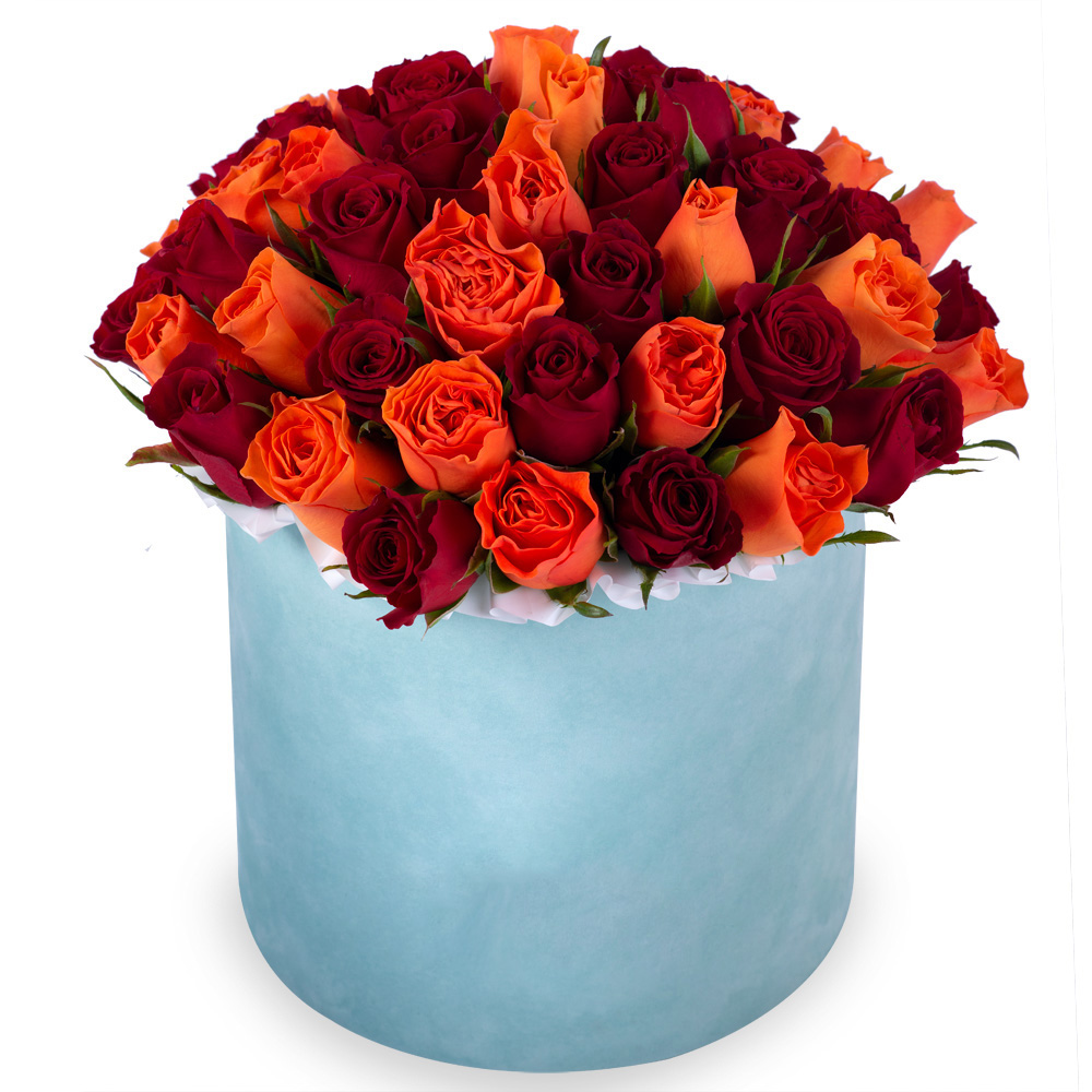 51 разноцветная роза в зеленой бархатной шляпной коробке