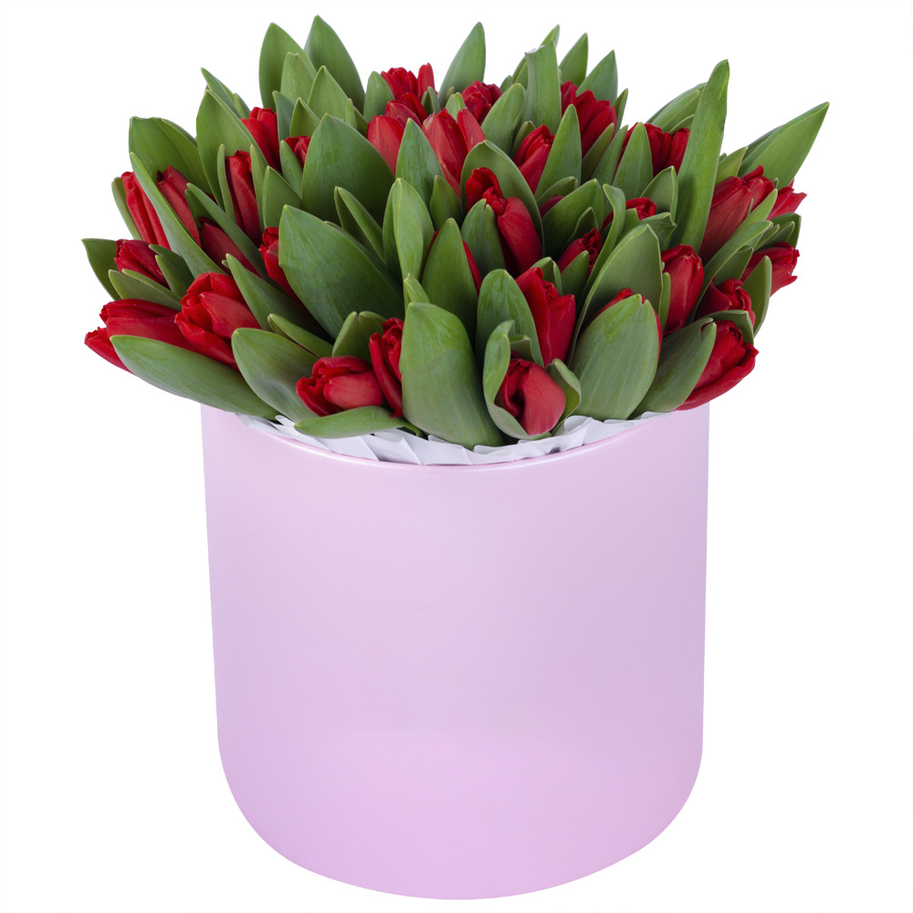 51 красный тюльпан в розовой шляпной коробке