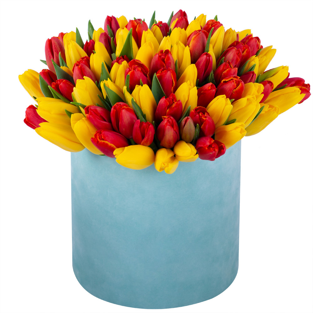 101 разноцветный тюльпан в зеленой бархатной шляпной коробке