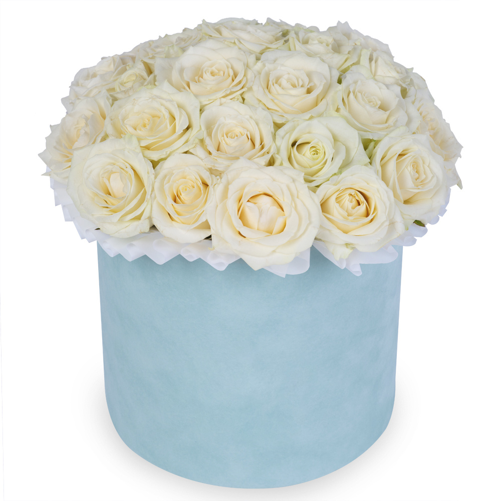 25 белых роз premium в зеленой бархатной шляпной коробке