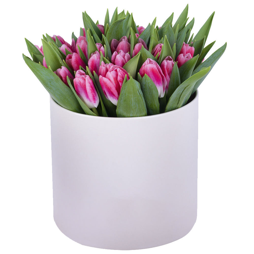 51 Бело-малиновый тюльпан в кремовой шляпной коробке
