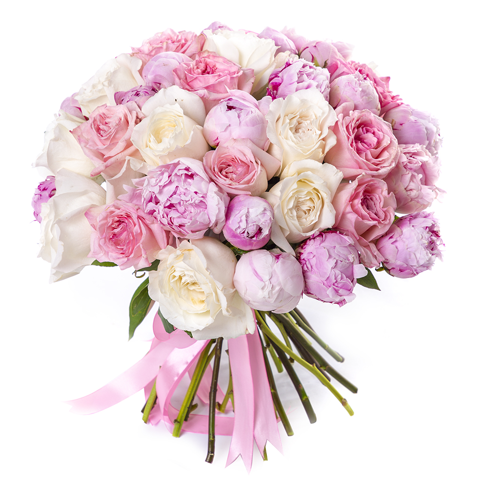 Букет с разноцветными розами и пионами