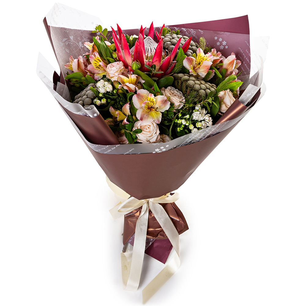 Букет с кустовой розой, протеей и брунией