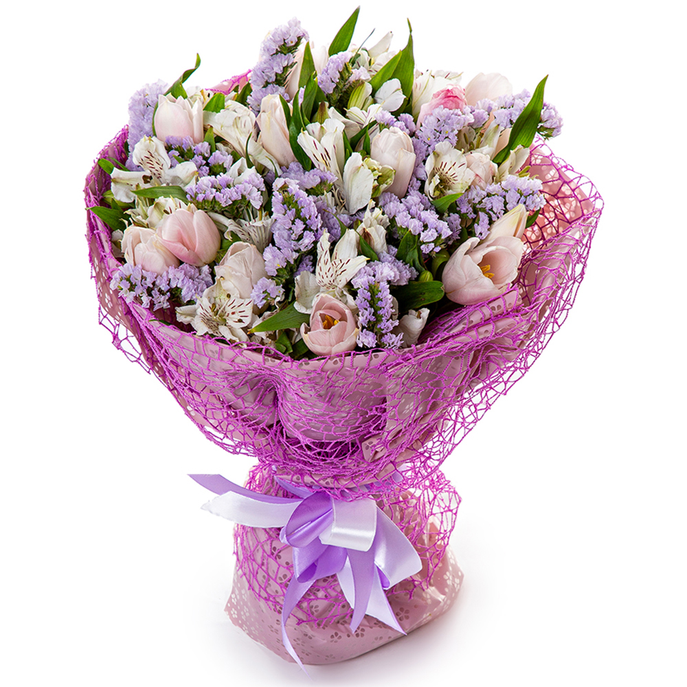 Букет с тюльпанами, альстромерией и статицей