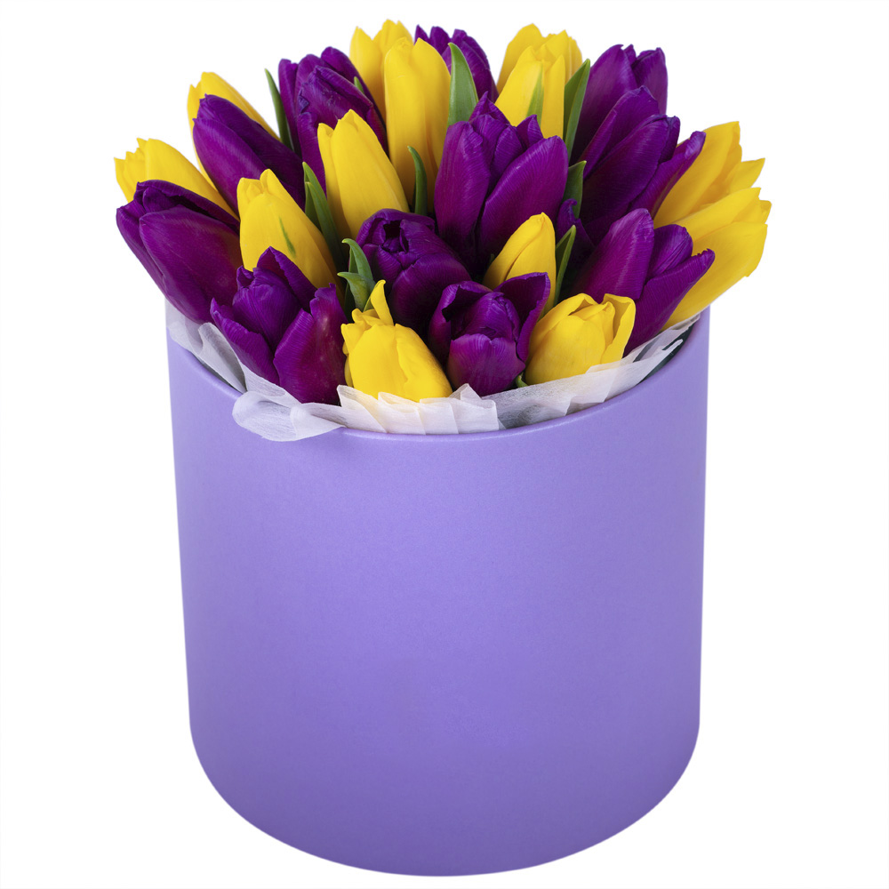 25 разноцветных тюльпан в фиолетовой шляпной коробке