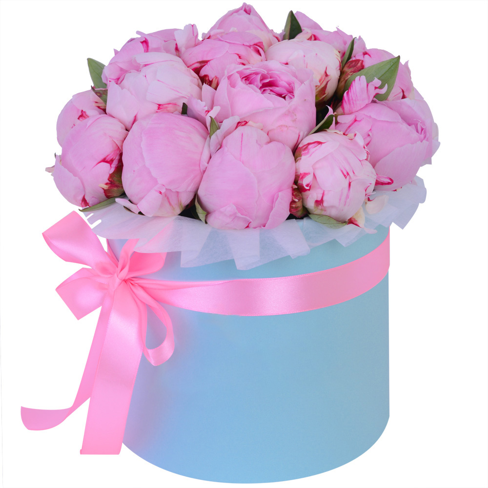Букет из 19 розовых пионов в голубой шляпной коробке