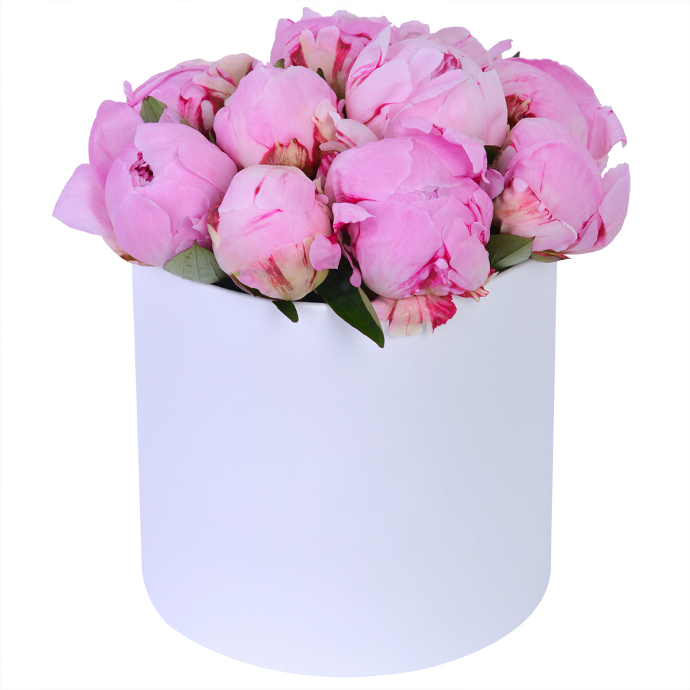 Букет из 11 розовых пионов в белой шляпной коробке