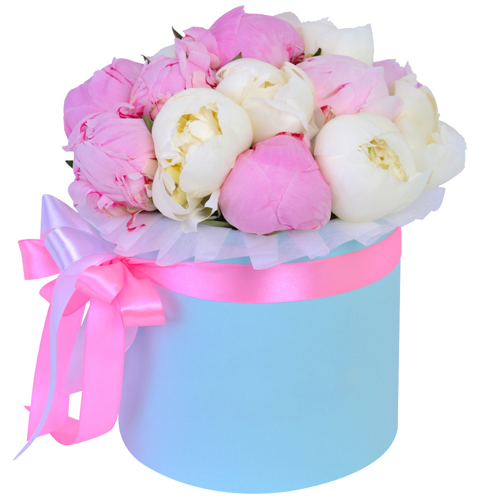 Букет из 11 разноцветных пионов в голубой шляпной коробке