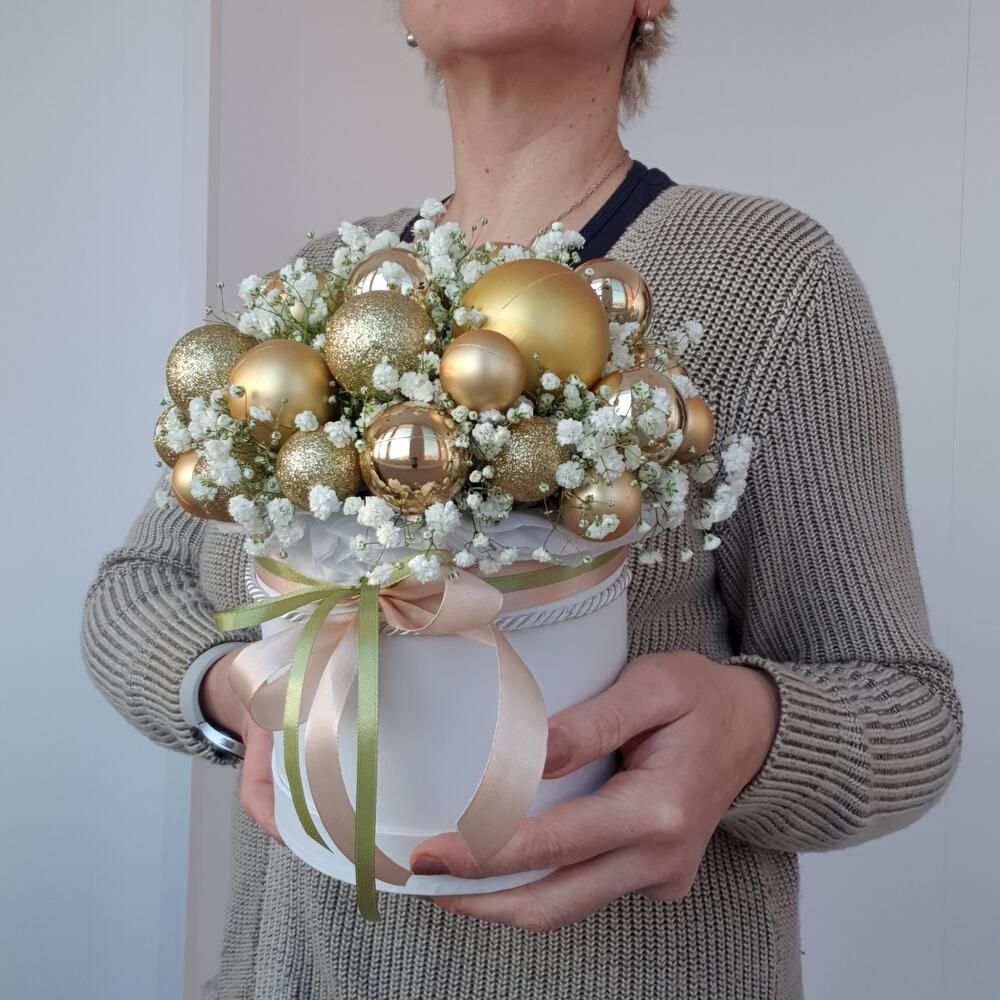 Новогодняя композиция в шляпной коробке из гипсофилы и новогодних шаров