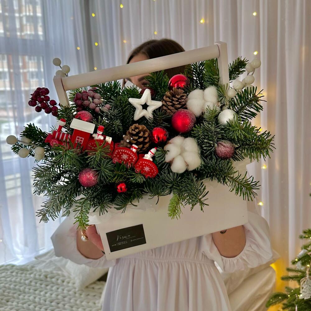 Зимняя композиция с живой елью, натуральным хлопком и новогодним декором