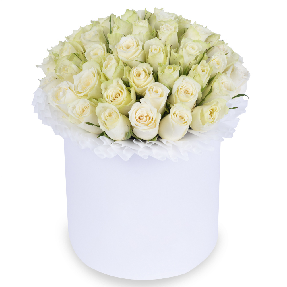 Букет из 35 белых роз в белой шляпной коробке