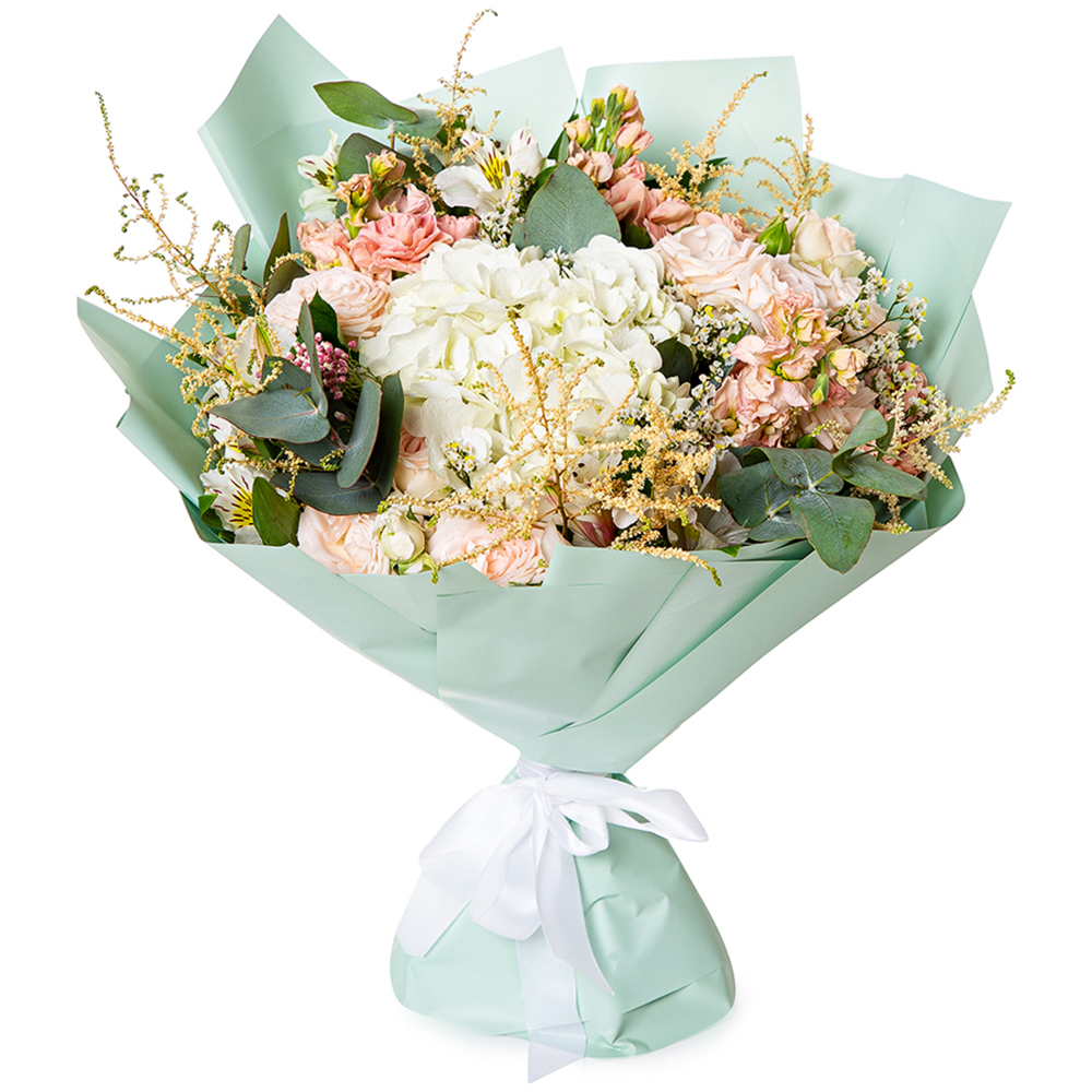 Букет с гортензией, кустовой розой и маттиолой