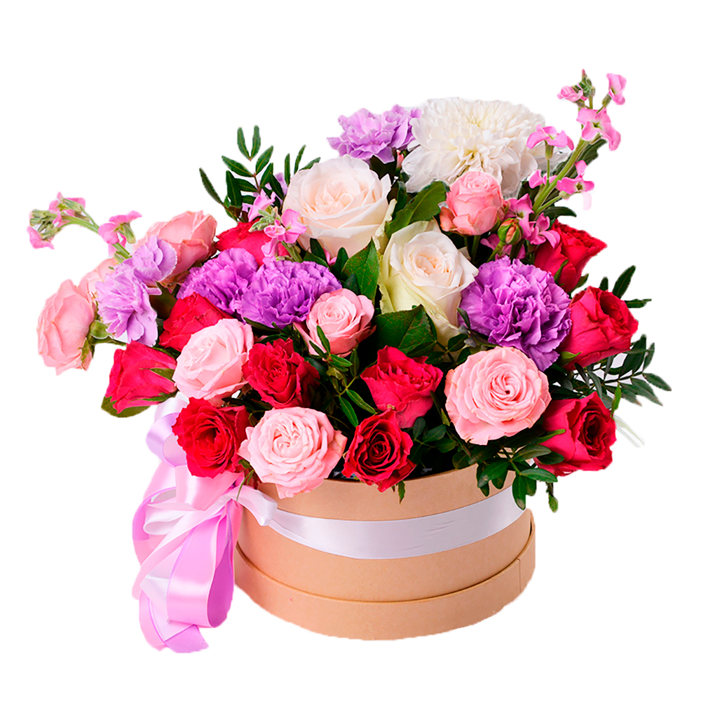 Букет с розами и гвоздиками в шляпной коробке