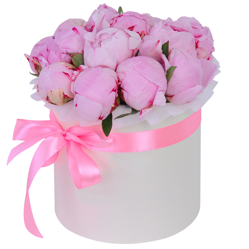 Букет из 15 розовых пионов в кремовой шляпной коробке