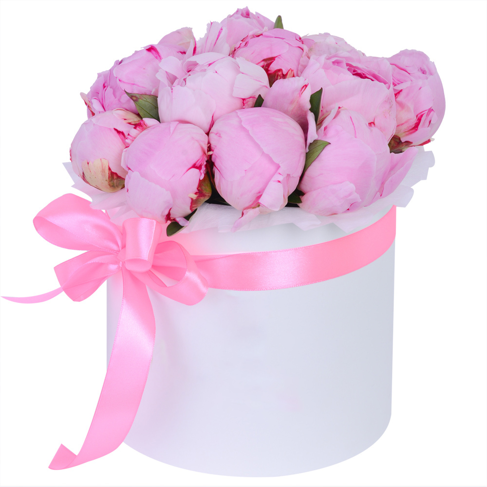 Букет из 15 розовых пионов в белой шляпной коробке