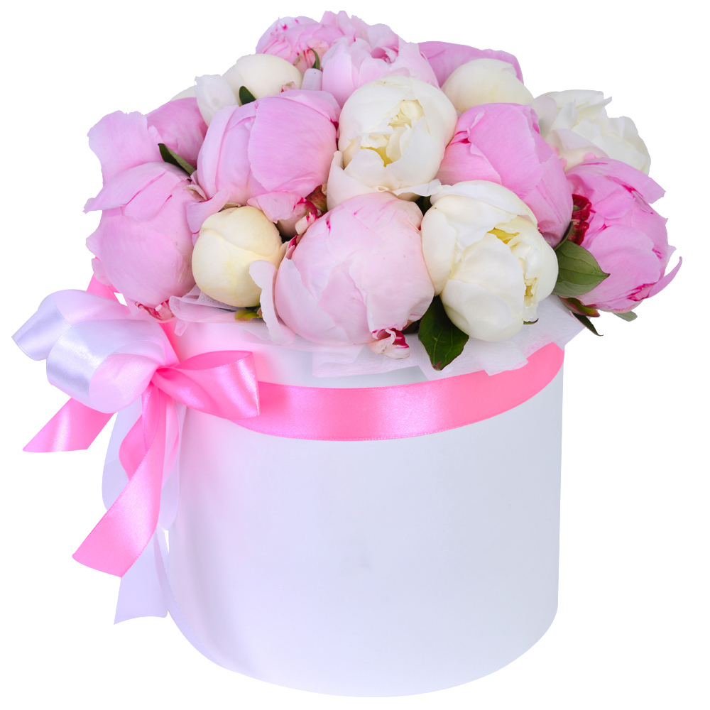 Букет из 19 разноцветных пионов в белой шляпной коробке
