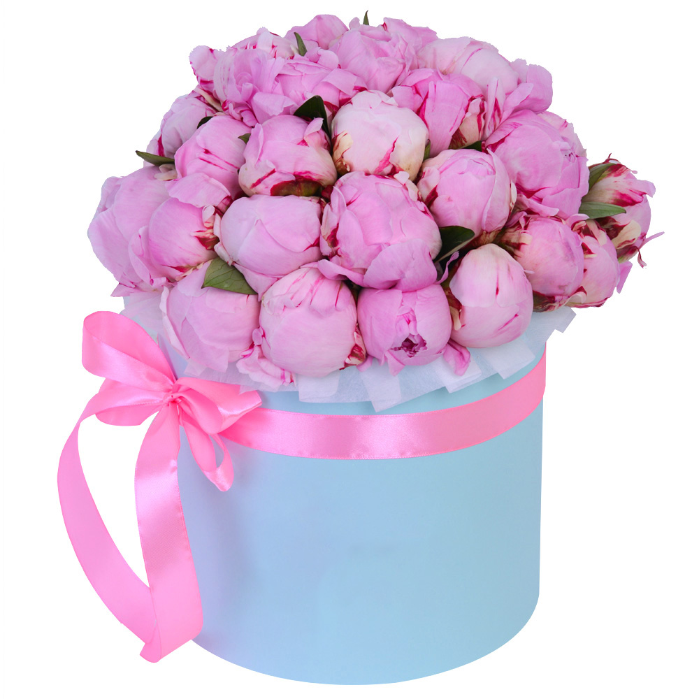 Букет из 35 розовых пионов в голубой шляпной коробке