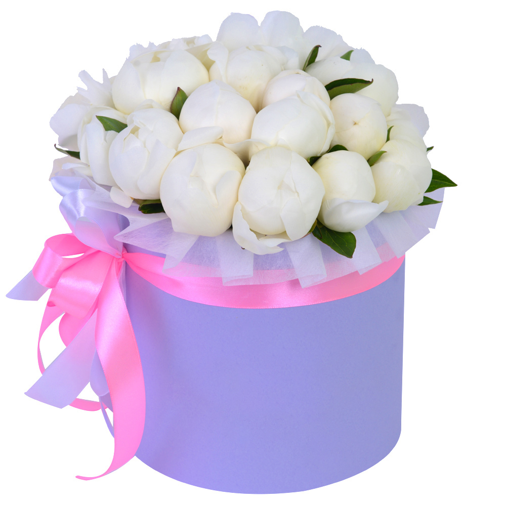 Букет из 21 белого пиона в фиолетовой шляпной коробке