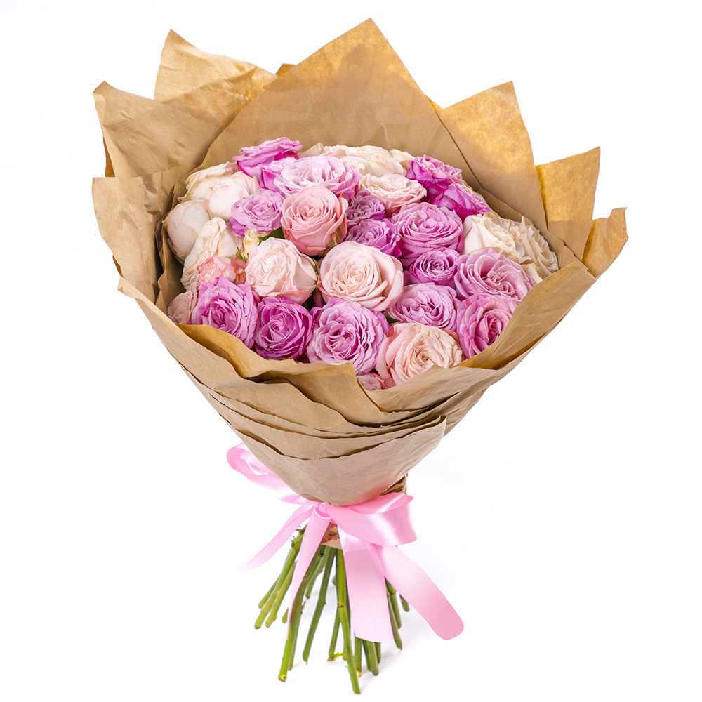 21 разноцветная кустовая роза в крафте