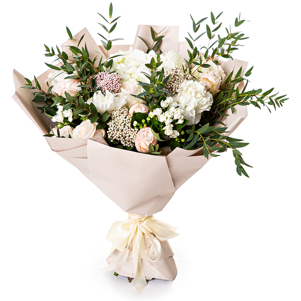 Букет с гортензией, розами и рускусом