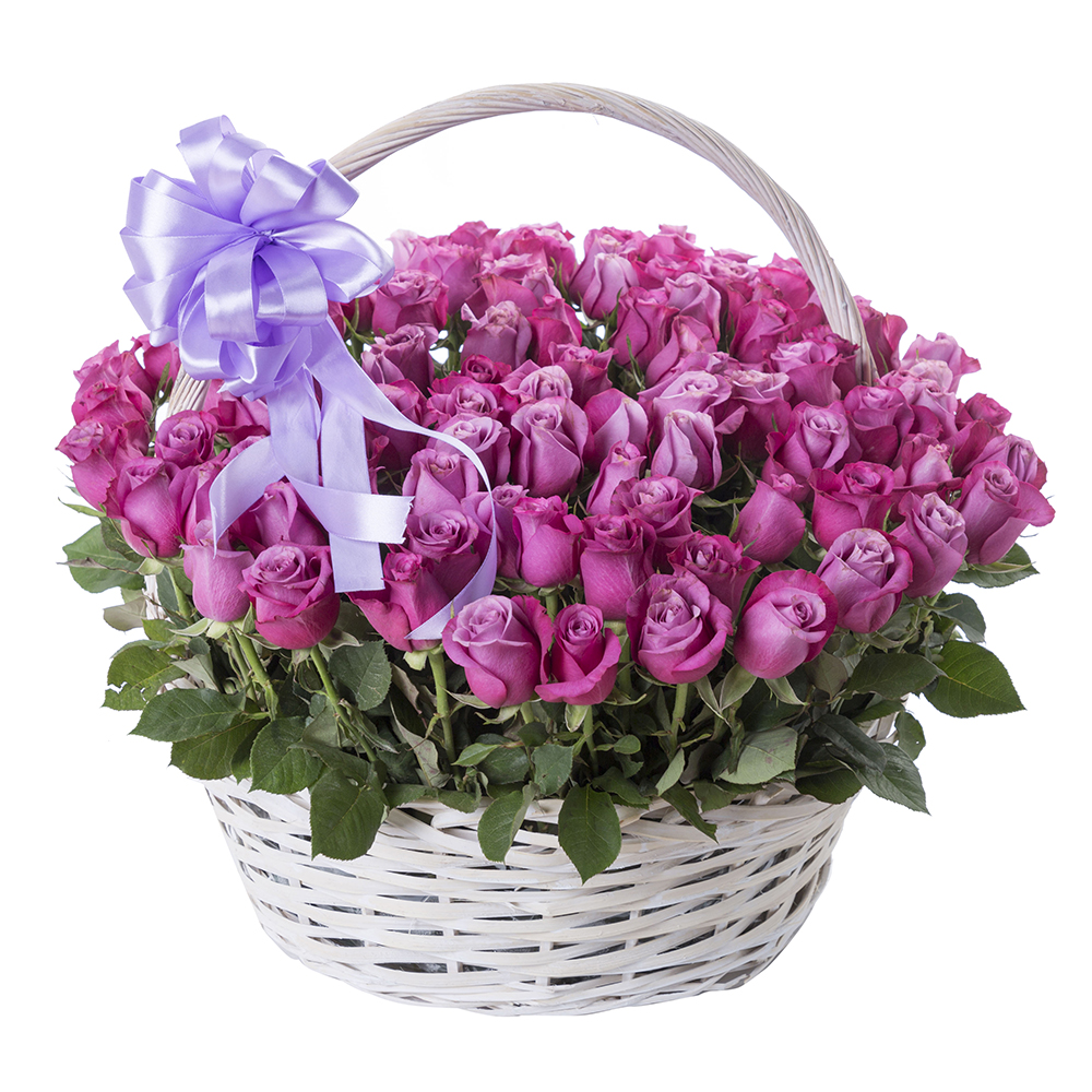 101 сиреневая роза в корзине с лентой