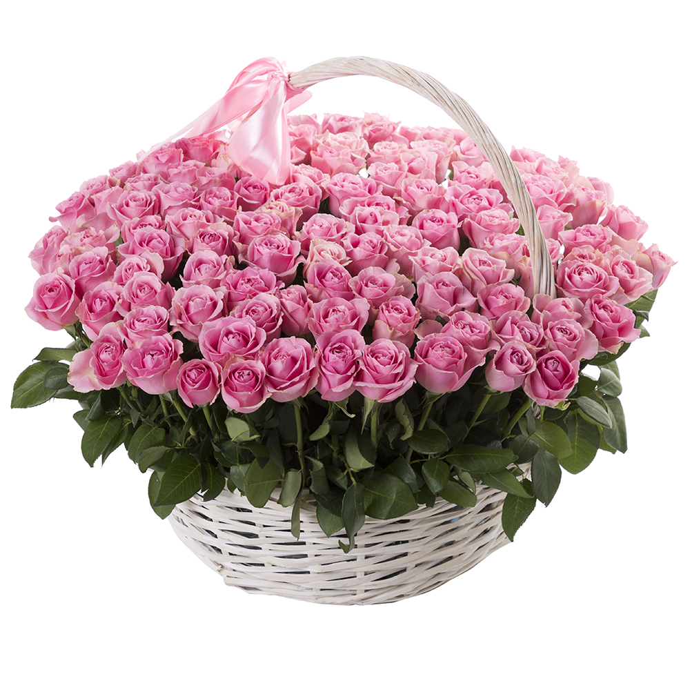 101 розовая роза в корзине с лентой