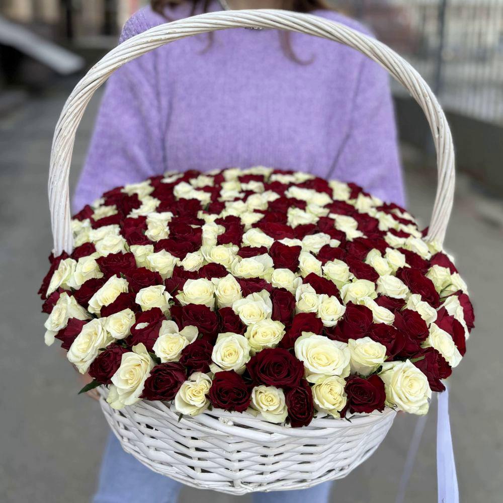 201 красная и белая роза в корзине
