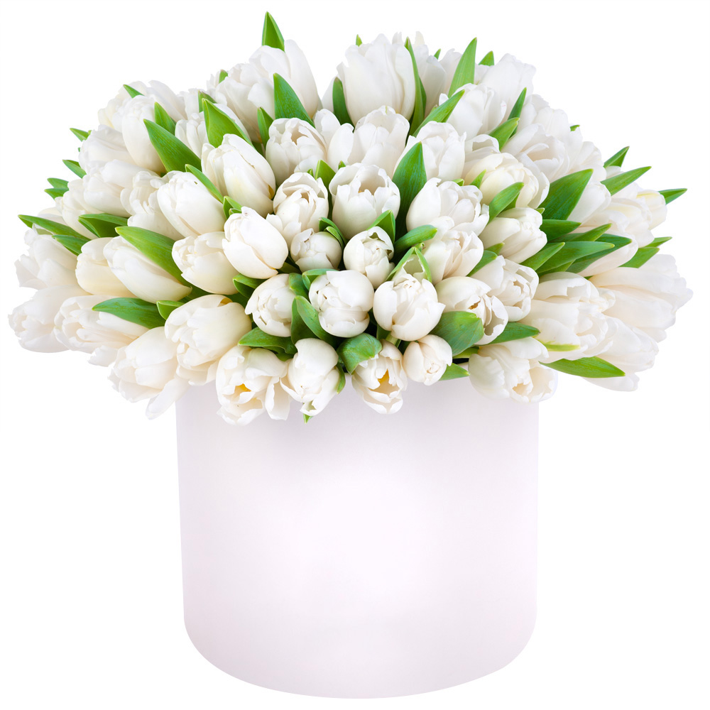 101 белый тюльпан в кремовой шляпной коробке