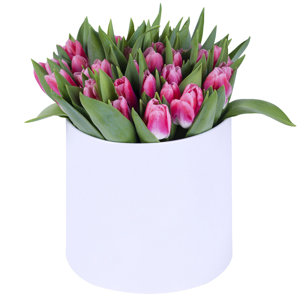 51 Бело-малиновый тюльпан в белой шляпной коробке