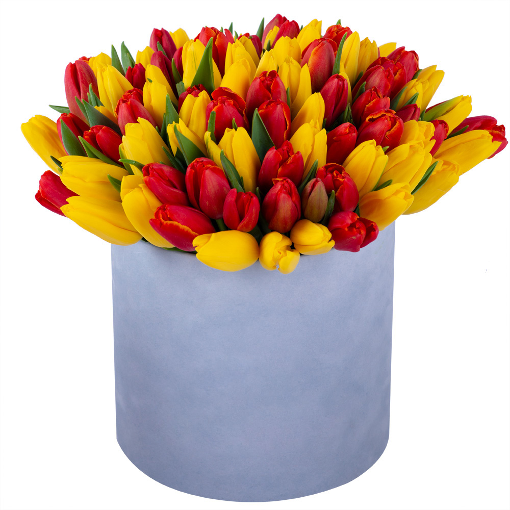 Букет из 101 разноцветного тюльпана в серой бархатной шляпной коробке
